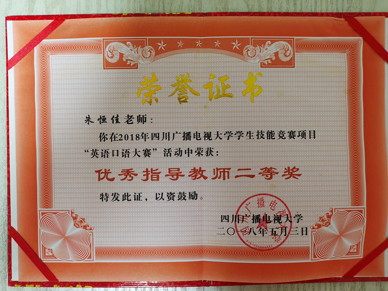 四川分部朱恒佳-2018年四川广播电视大学学生技能竞赛项目“英语口语大赛”优秀指导教师二等奖