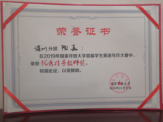 深圳分部陶嘉-写作大赛优秀指导教师奖