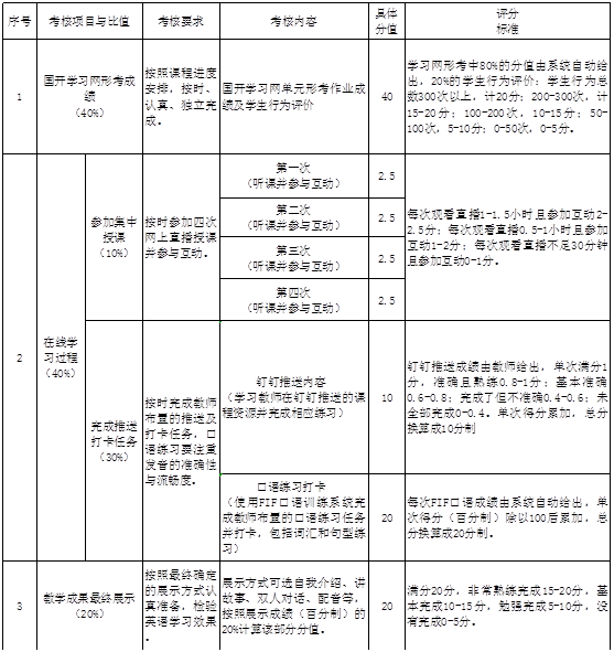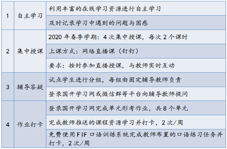 在国家开放大学公共英语多模态教学改革中,太原实验学院(正诚伟业学习中心)被选定为第三批试点的落地单位。通过前期的调研,最终确定试点课程为《管理英语1》和《管理英语2》,试点对象是在太原实验学院正诚伟业学习中心2020年春季入学的新生自愿报名后,从中选取共34名学生参加试点。此次多模态教学改革采用100%形成性考核方式,选取“全在线模式”为教学改革探索模式,旨在切实提高学生的英语运用能力,达到“学一点、会一点、用一点”的学习效果。同时,在教改过程中注重突出自身的亮点,注重总结适合体系内推广的试点项目经验,为网络教学团队建设提供可借鉴、可推广的“试验性、引领性”案例和方案。
